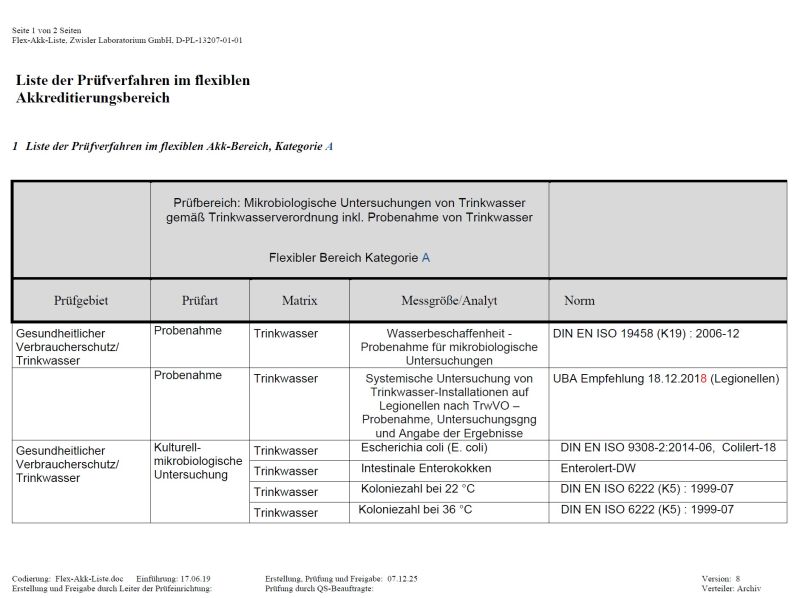 Prüfverfahren nach der Trinkwasserverordnung - TrinkwV -***Mikrobiologisch-hygienische Prüfungen im Lebensmittelbereich / Umgebung